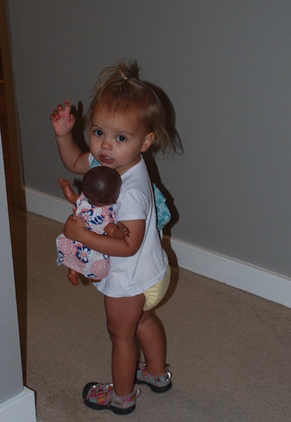 | She's got a large constellation of spots in her diaper area, so she's been running around naked all week. She's a fan! |